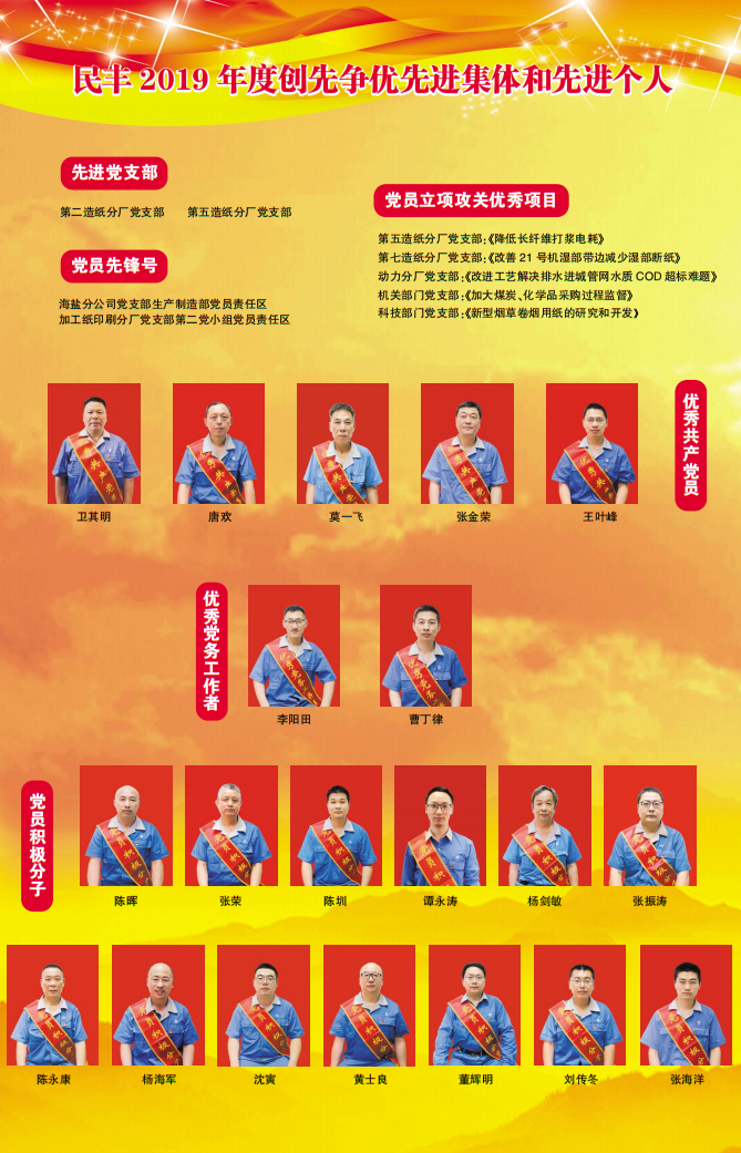 大会首先对第二造纸分厂、第五造纸分厂2个先进党支部,海盐分公司党支部生产制造部党员责任区、加工纸印刷分厂党支部第二党小组党员责任区2个党员先锋号,第五造纸分厂党支部、第七造纸分厂党支部、动力分厂党支部、机关部门党支部、科技部门党支部5个党员立项攻关优秀项目,卫其明等5名优秀共产党员,李阳田等2名优秀党务工作者,陈晖等13名党员积极分子进行了表彰。受表彰的先进集体、先进个人代表先后作了大会交流发言。