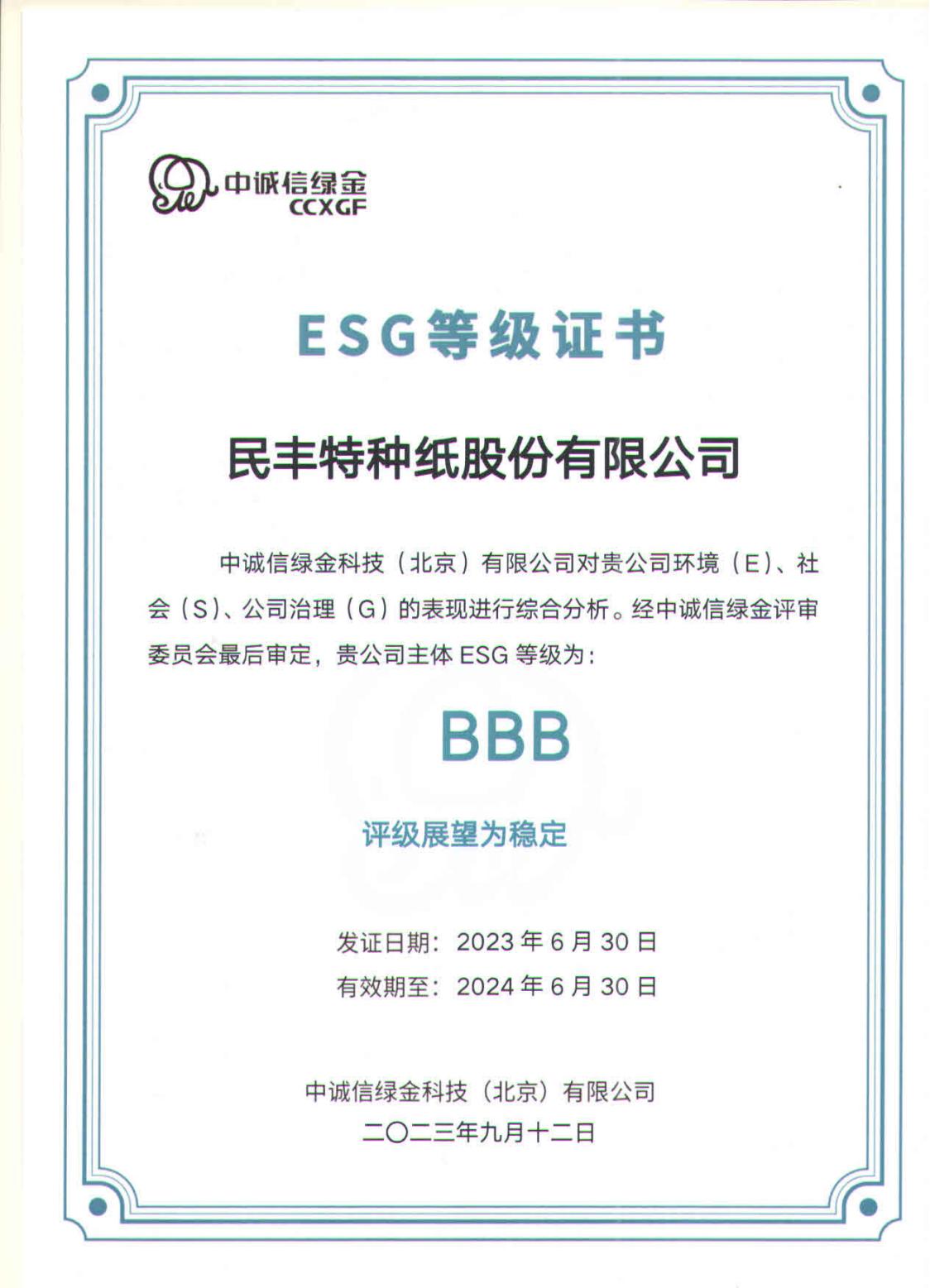 近日,公司收到中国第一、全球第四大评级机构——中诚信旗下中诚信绿金颁发的ESG登记证书。经中诚信绿金评审委员会最后审定,尊龙凯时特纸主体ESG等级为:BBB(位于行业22/156水平,可持续发展潜力较大),评级展望为稳定,在环境纬度中并列行业第一名。