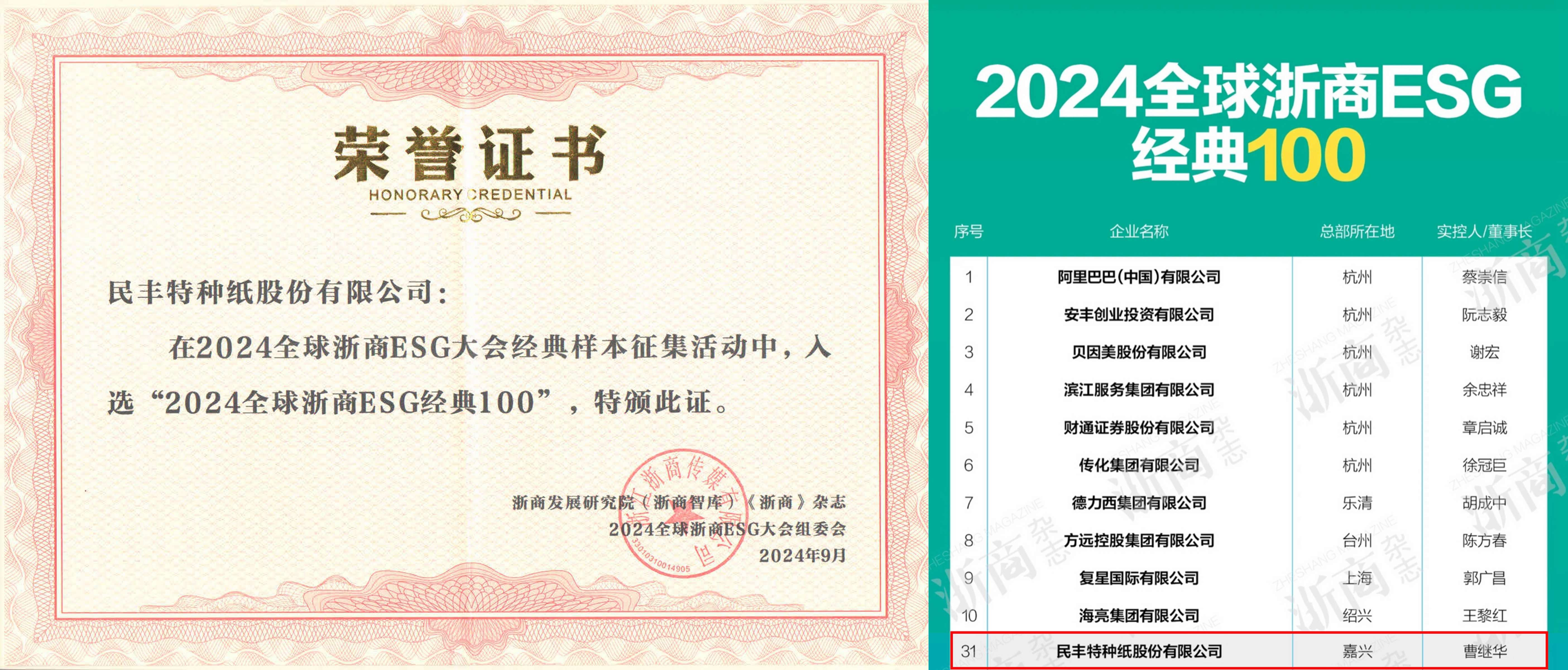 尊龙凯时特纸荣耀登榜2024全球浙商ESG经典100